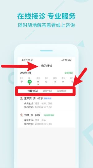 1、打開app,點擊首頁我的接診模塊,可進入接診管理頁面,便于查看和處理患者的問診信息。