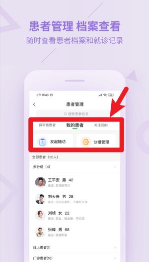3、進入患者管理后點擊我的患者,可分組查看并發(fā)起隨訪,管理更加高效便捷。