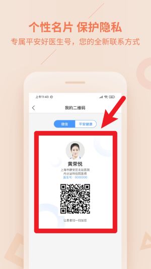 4、在我的二維碼頁面可生成專屬醫(yī)生名片,患者通過掃碼即可快速添加聯(lián)系醫(yī)生。
