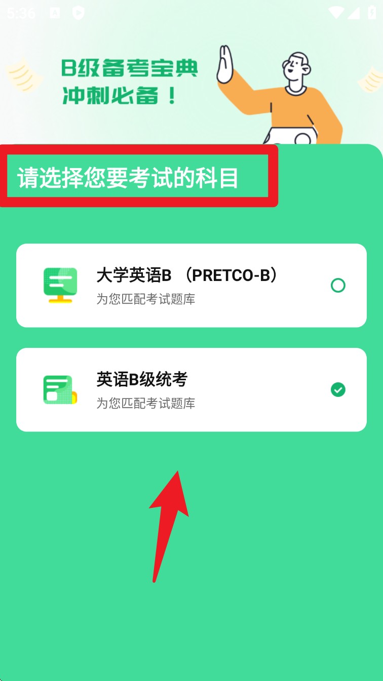 1. 進入App后選擇要考試的科目,可選大學英語B或英語B級統考,匹配對應題庫資源。