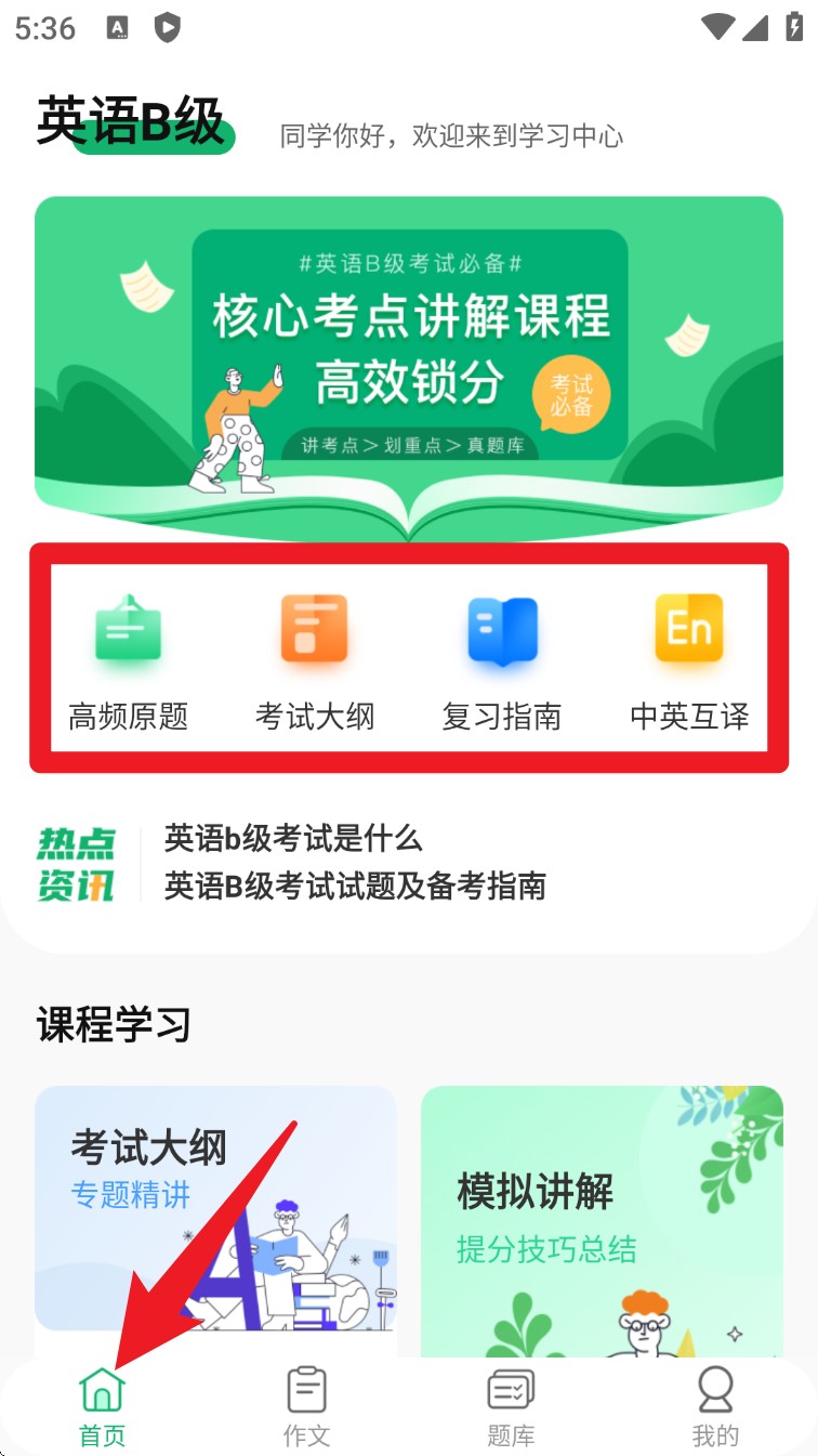 2. 進入首頁后,可點擊高頻原題、考試大綱等模塊,快速找到所需復習內容與資料。