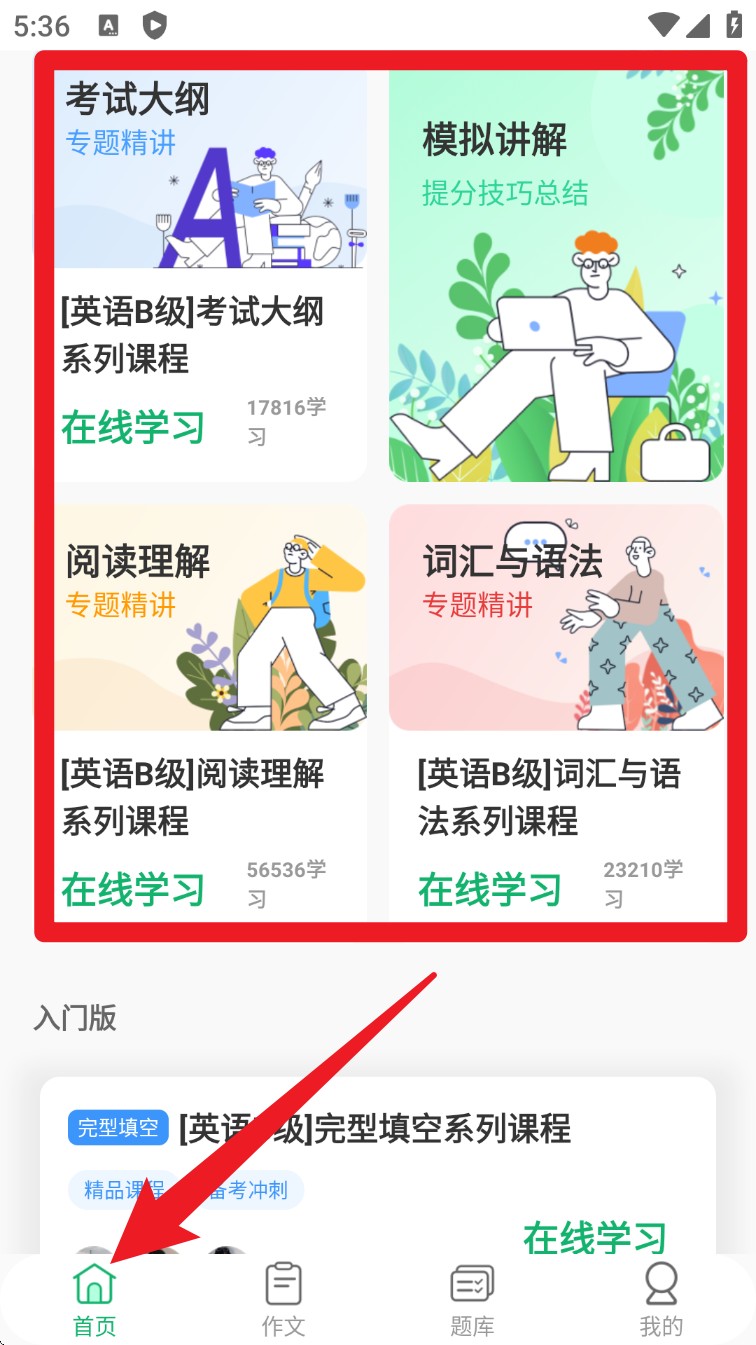 3. 向下滑動首頁,可查看詳細的專題課程分類,包括閱讀理解、詞匯語法等熱門系列。
