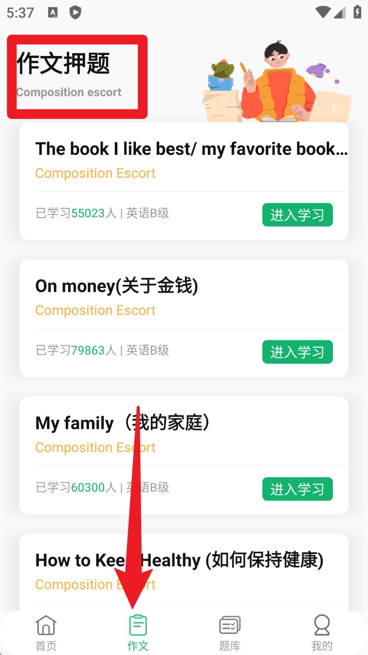 4. 切換至作文頁簽,即可進入作文押題頁面,按題型分類訓練英文寫作表達能力。