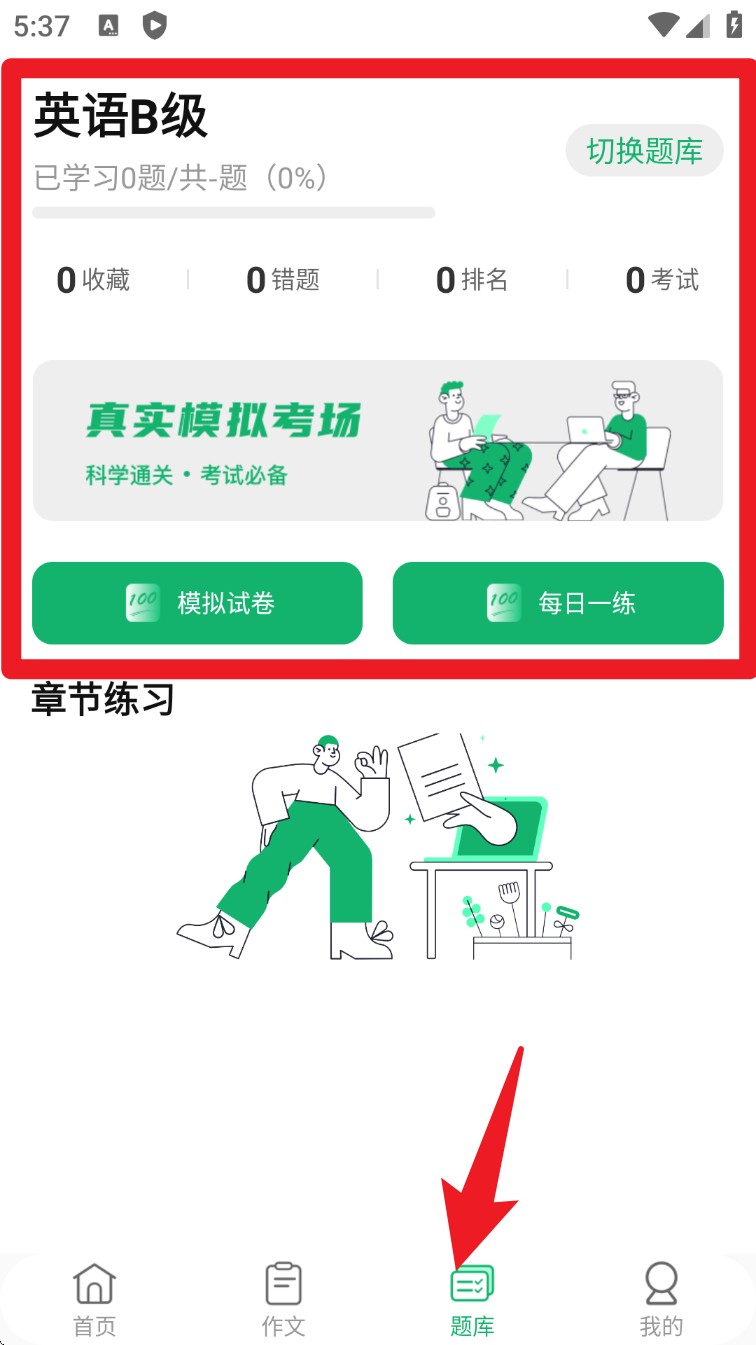5. 點擊題庫頁簽可進入模擬練習模塊,支持刷題、每日一練與模擬試卷等功能入口。