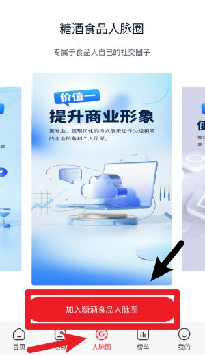 3、進(jìn)入人脈圈并點(diǎn)擊加入糖酒食品人脈圈按鈕,可加入食品行業(yè)社交圈拓展人脈。