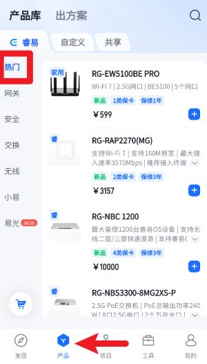 3、點擊底部產品選項進入產品庫頁面,可按分類瀏覽熱門設備,并查看型號、價格及質保信息。