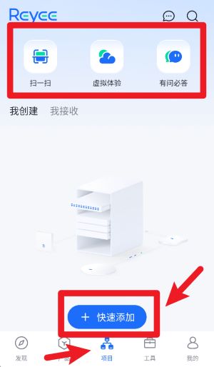 4、點擊底部項目按鈕后,通過“快速添加”可創建新項目,并支持掃碼、虛擬體驗與在線答疑功能。