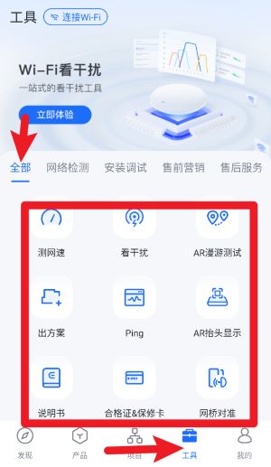 5、點擊底部工具標簽,在全部工具頁中選擇測速、看干擾等功能,幫助完成網絡安裝與調試任務。