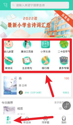 2、進(jìn)入首頁(yè)點(diǎn)擊底部首頁(yè)圖標(biāo),即可瀏覽古詩(shī)分類內(nèi)容,如小學(xué)古詩(shī)、宋詩(shī)詞及排行榜等。