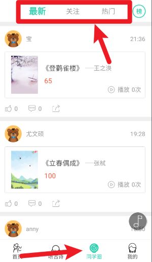 3、點(diǎn)擊底部同學(xué)圈可查看他人發(fā)布的古詩(shī)朗讀動(dòng)態(tài),并能在最新、關(guān)注、熱門中切換。