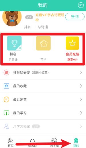 4、點(diǎn)擊右下角我的頁(yè)面,可查看學(xué)習(xí)進(jìn)度、背誦排名,并進(jìn)行會(huì)員充值等個(gè)性化操作。