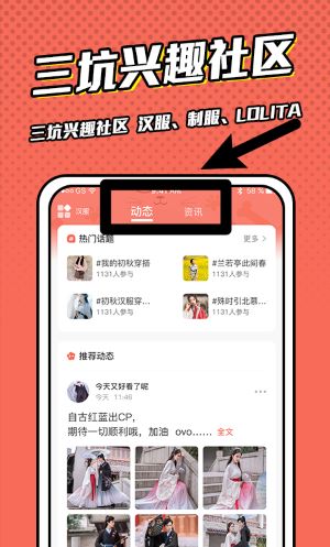 1、打開三坑興趣社區后,點擊動態即可查看漢服、制服、Lolita等熱門話題內容并參與交流互動。