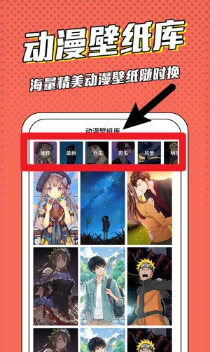 2、進入動漫壁紙庫,點擊上方分類標簽即可瀏覽不同風格的動漫壁紙并自由選擇更換喜歡的背景圖。