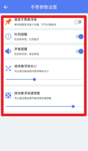 3、在手勢參數設置中可以調整浮球大小與透明度,并可啟用語音提示及吐司提醒等反饋方式。