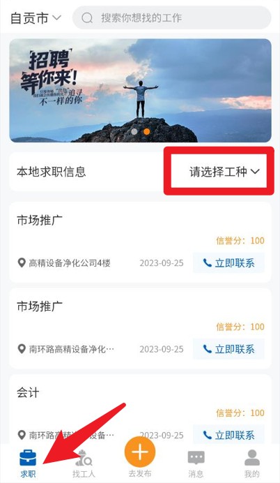 1、點擊底部求職按鈕可查看本地招聘信息,選擇工種篩選職位并快速聯系雇主。