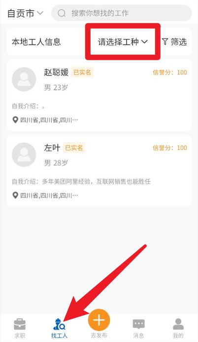 2、切換至找工人欄目后,可瀏覽工人信息列表,按工種選擇合適的勞動力。