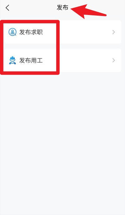 3、點擊中間去發布圖標后,選擇發布求職或發布用工進行的信息發布。
