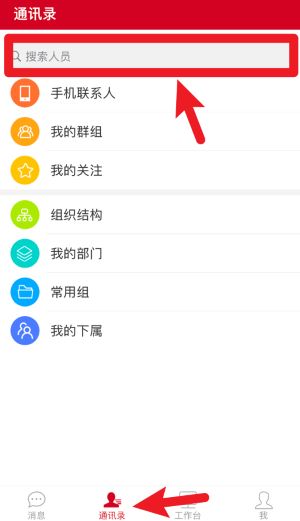 2、在通訊錄頁面中可以通過關(guān)鍵詞搜索人員,并快速訪問組織結(jié)構(gòu)、我的群組及常用聯(lián)系人列表。