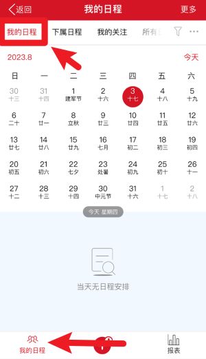 3、打開我的日程界面后可通過日歷視圖查看每日安排,并支持查看下屬與關(guān)注對(duì)象的日程計(jì)劃。