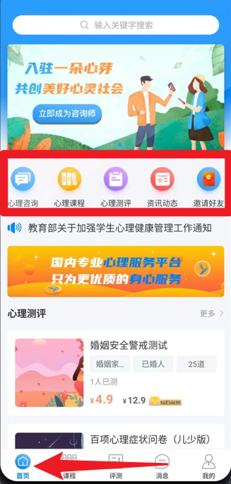 2、在首頁頁面,可進行心理咨詢、心理課程、心理測評、邀請好友等操作,便于快速使用主要功能。