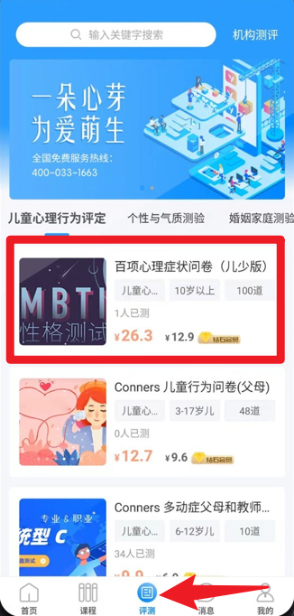 4、在評測頁面,支持多類心理測評,如兒童心理行為評定、婚姻家庭相關問卷等,選擇后即可在線答題。