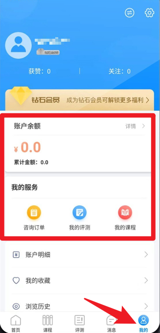 5、在我的頁面,可查看賬戶余額、咨詢訂單,以及收藏記錄和瀏覽歷史,便于管理個人學習與服務。