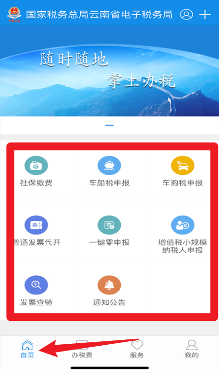 1、進入首頁,可快捷辦理社保繳費、車船稅申報、車購稅申報、發票查驗等常用功能。