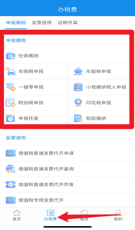 2、點擊辦稅費,支持社保繳納、車購稅申報、附加稅申報、申報作廢等全流程操作。