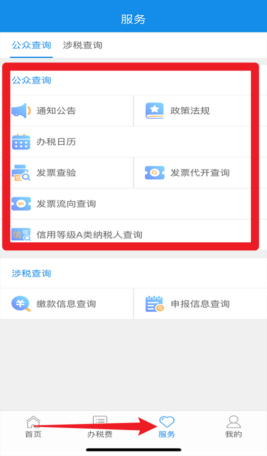 3、在服務板塊,可進行公告通知、政策法規、發票流向及信用等級查詢。