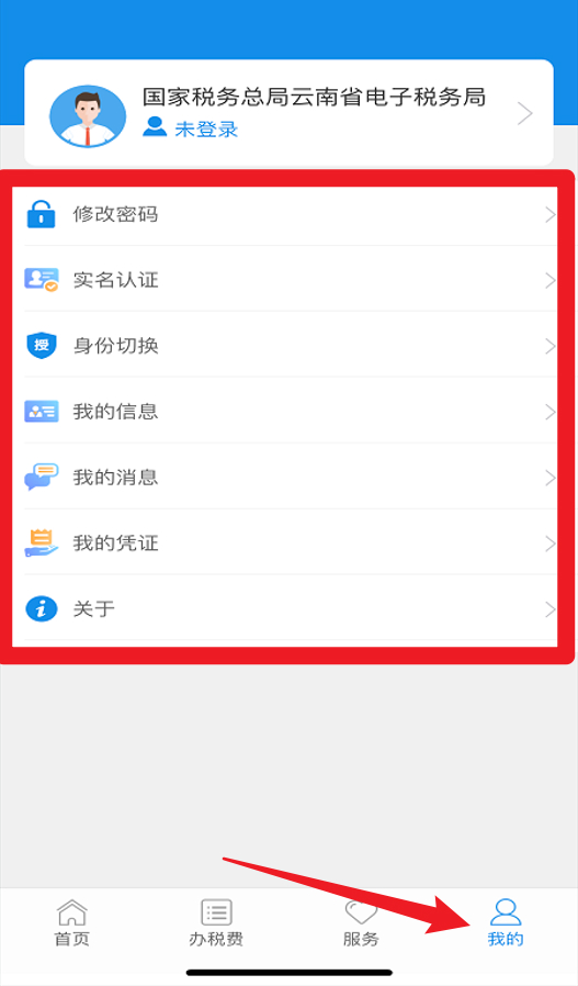 4、進入我的,可完成實名認證、修改密碼、身份切換,查看我的憑證與消息。