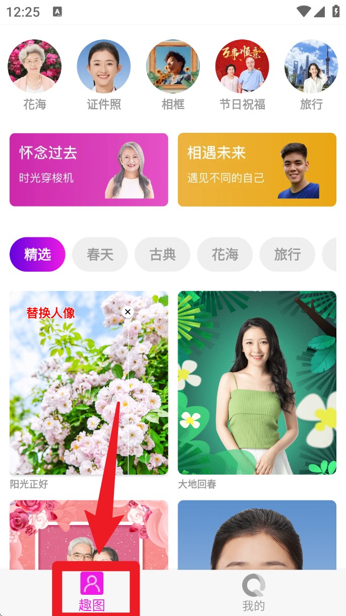 1. 打開App進入首頁,點擊底部趣圖標簽頁可瀏覽花海等模板分類,點擊任意模塊進入制作界面。