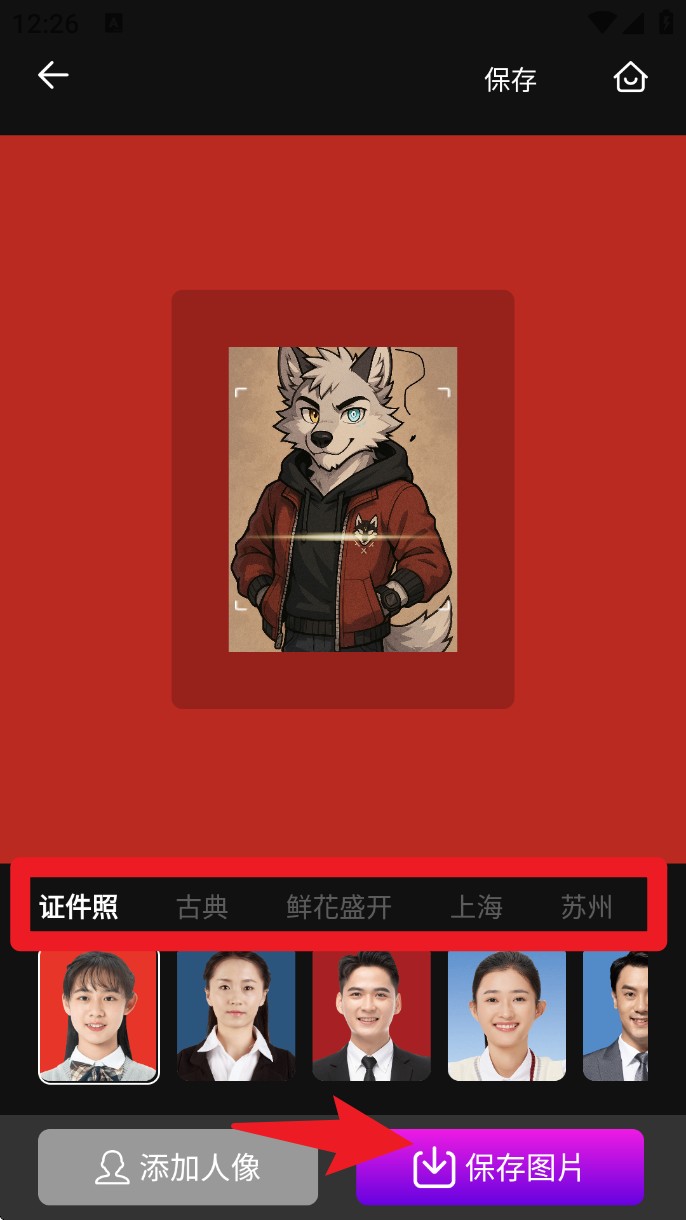 2. 在證件照模板下選擇合適背景,上傳個人頭像后自動摳圖并嵌入新背景,可直接點擊保存圖片進行下載。