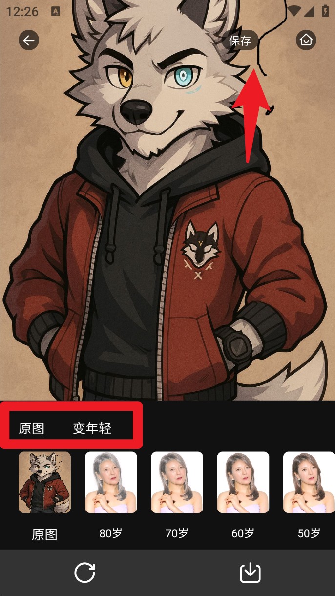 3. 進入變年輕功能區后,上傳圖像即可切換為不同年齡段樣貌,包含80歲至20歲等多個變化可供預覽和保存。