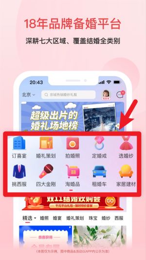 2、首頁導(dǎo)航圖標(biāo)涵蓋婚禮策劃、拍婚照、選婚紗等功能板塊,一鍵直達滿足新人多元備婚需求。