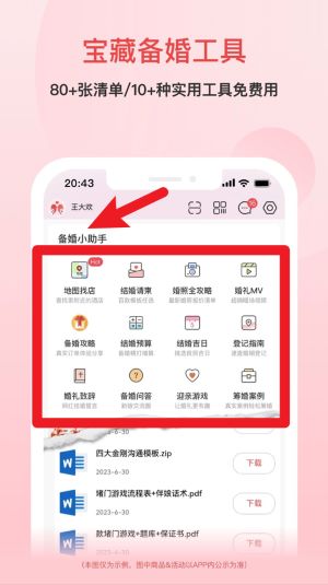 5、備婚工具專區(qū)提供80多張清單與10多種實用工具,覆蓋婚禮流程策劃與事項提醒功能。