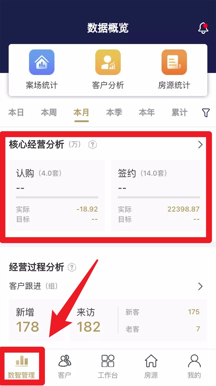 2. 登錄后進入首頁,點擊底部菜單數智管理,可查看核心經營分析、客戶到訪等數據概況。