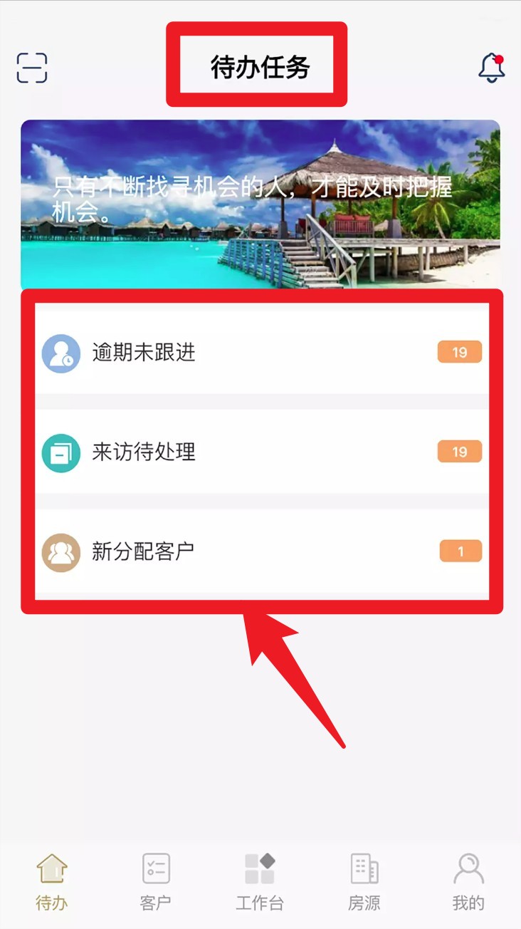 4. 進入待辦頁面,查看逾期未跟進、來訪待處理與新分配客戶等待辦任務,及時處理高效推進。