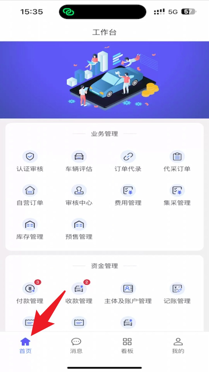 2. 登錄成功后,系統自動跳轉至首頁,在此可以訪問業務管理與資金管理模塊。