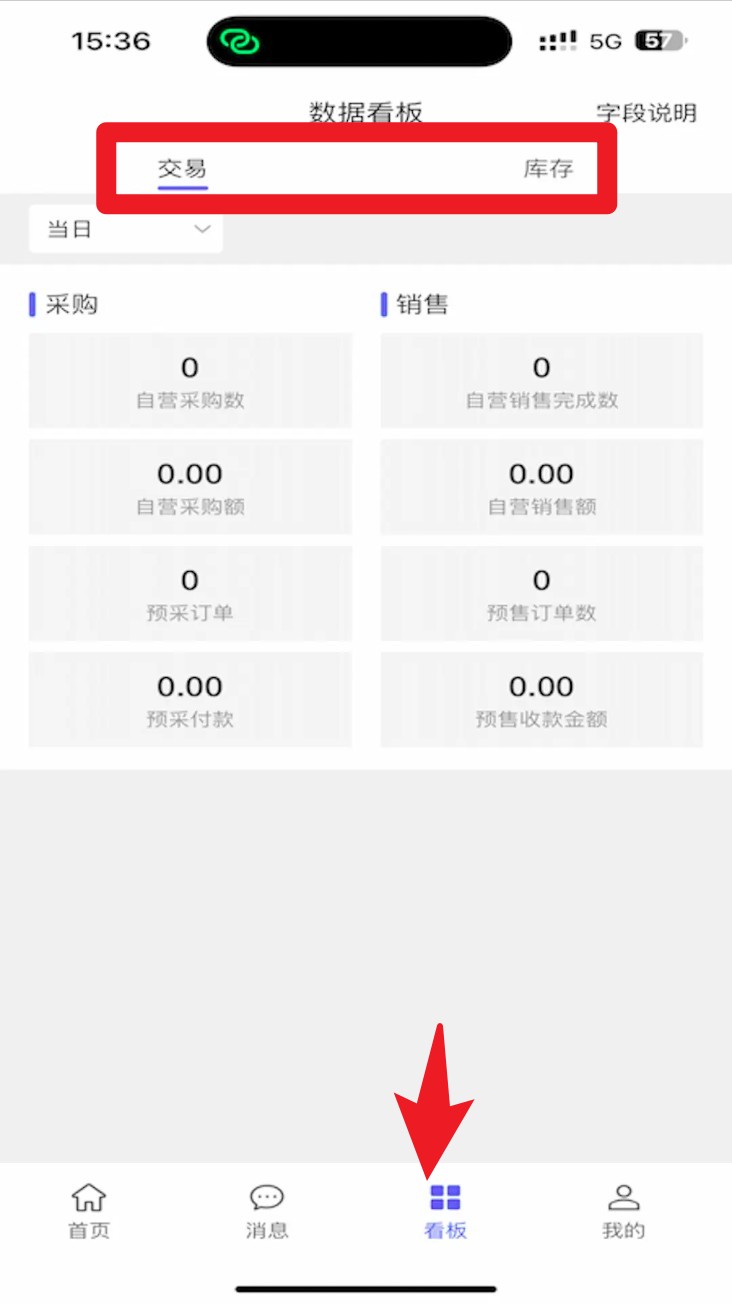 4. 切換至底部導航欄看板可查看交易與庫存數據,支持按日查看采購與銷售相關指標。