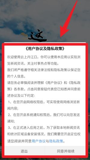 1、首次打開APP之后,會彈出《用戶協議及隱私政策》提示頁面,用戶需仔細閱讀,就可以進入應用了。