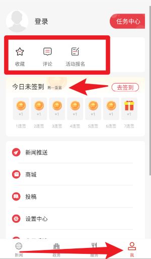 5、在我的頁面,用戶可查看收藏、評論、活動報名情況,進行新聞推送設置、商城訪問及投稿等個性化操作。