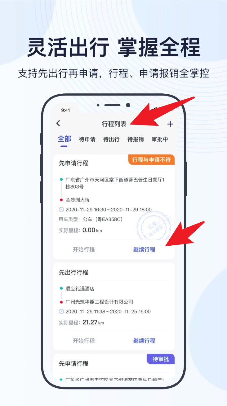4. 點擊行程記錄模塊可查看并管理所有行程申請,支持繼續行程、申請報銷等后續操作。