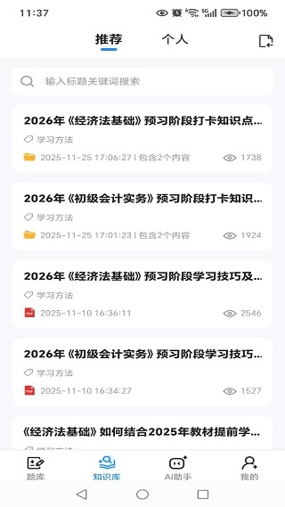 3、知識庫頁面提供豐富免費(fèi)學(xué)習(xí)內(nèi)容,輕松獲取所需備考資料;