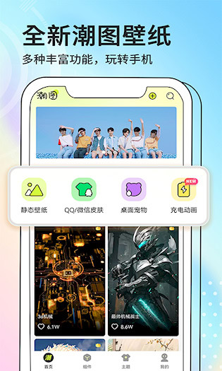 潮圖壁紙是一款手機界面個性化應用,提供豐富多樣的高清壁紙資源,內容涵蓋人物、動漫、風景等多個熱門主題,每日更新確保畫面始終新鮮有趣。所有壁紙都是無水印高清畫質,可以一鍵下載和設置為桌面鎖屏背景,讓美化手機變得更輕松愉快。