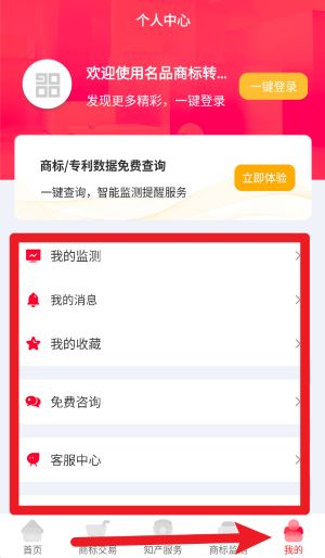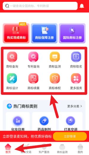 2、進入首頁后可看到商標查詢、專利查詢、商標監測等多個功能模塊,點擊任意圖標即可使用對應服務。