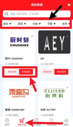 3、在商標交易頁可通過篩選條件查找商標,點擊查詢價格或聯系賣家快速獲取交易信息。