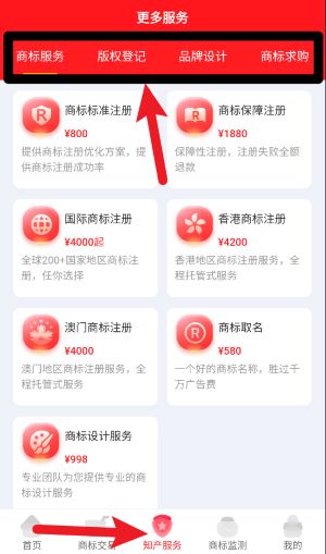 4、點擊知產服務進入更多服務頁面,可進行商標注冊、版權登記、品牌設計等操作并查看具體費用。