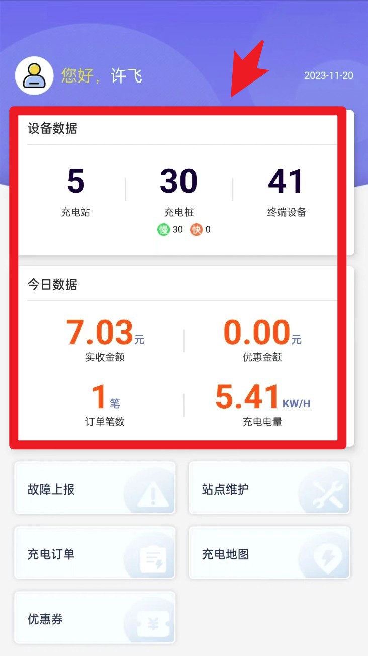 2. 登錄成功進入首頁,可查看充電站、充電樁與終端設備數量及當日實收、訂單與充電數據。