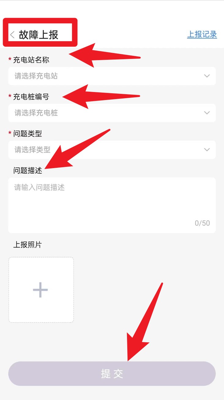 3. 點擊故障上報,選擇充電站與樁編號,填寫問題類型與描述,可上傳現場照片后提交。