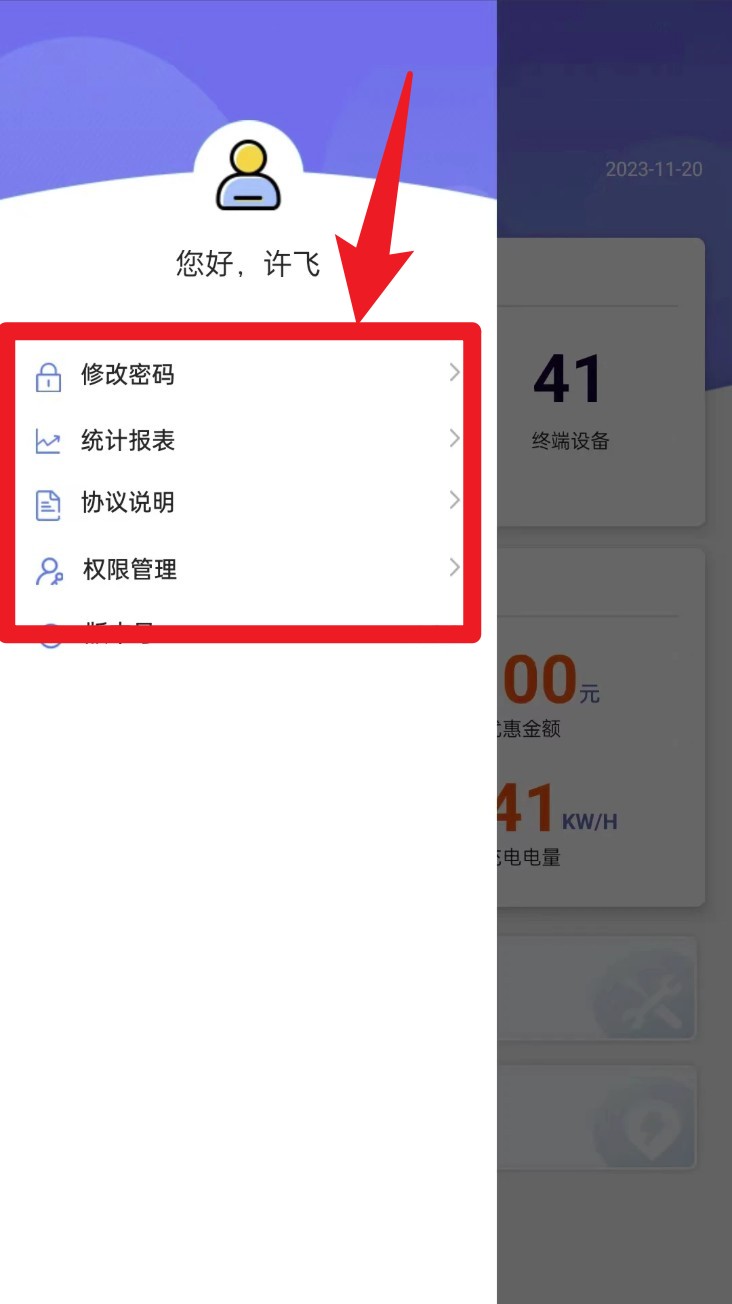 4. 點擊左上角頭像打開側邊欄,可進入修改密碼、查看統計報表、協議說明及權限管理功能。